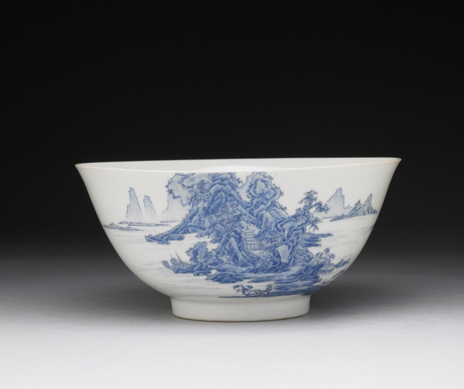 口窄唇,弧形深壁,矮圈足。薄胎白釉,弧形碗壁一面彩畫藍料山水,畫中山崖石壁上由細筆描繪出來的線條,為表現陰陽向背所暈染出來濃淡色澤,與凝聚於山頭